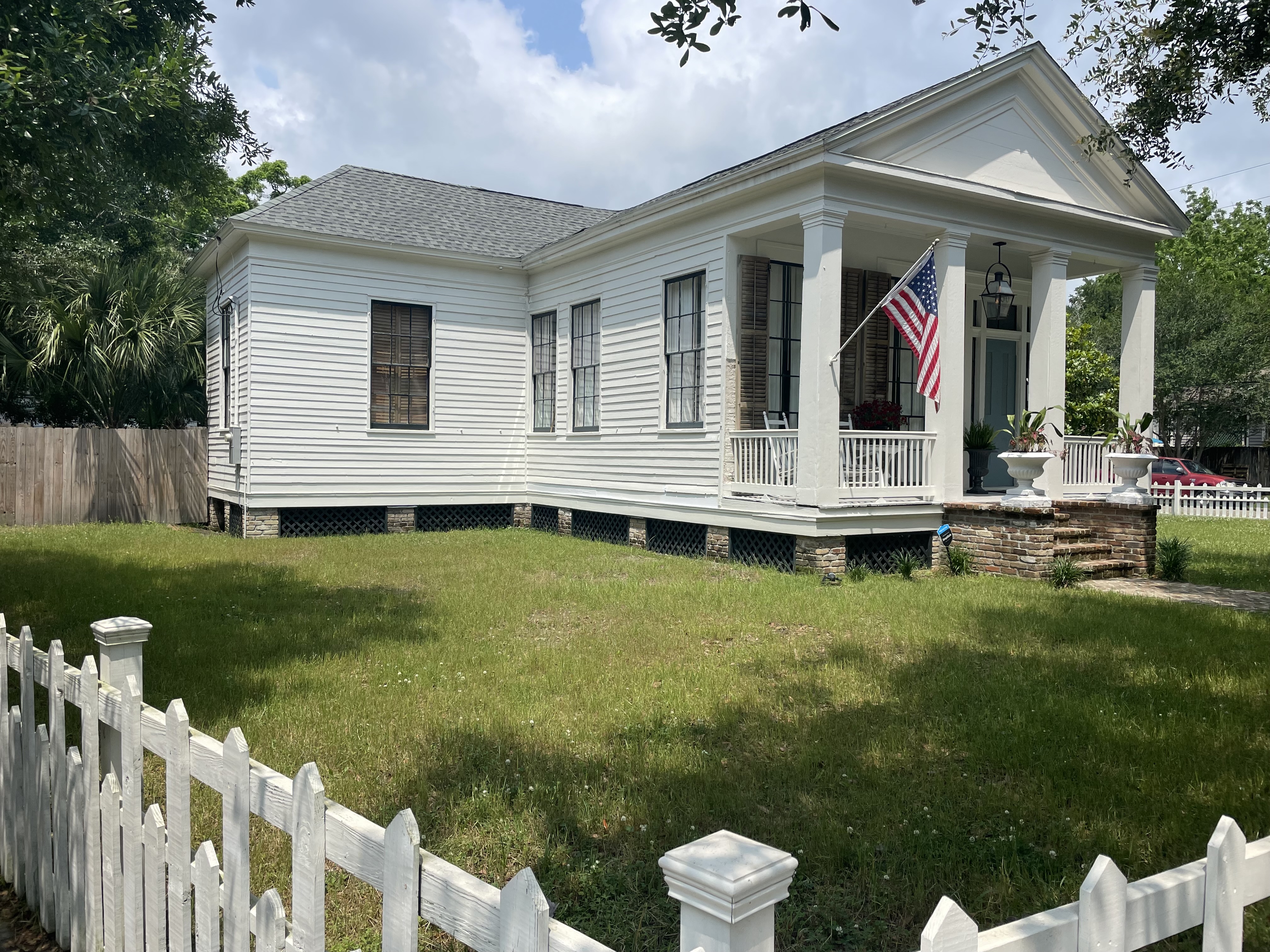 The buildings were repeatedly destroyed by fire in the French Quarter before safer building materials and building techniques were introduced— including fire lines built between roofs and mandates around density. The guide reviewed the major 4 styles of structures in New Orleans, and the eras they were built in— which we began to recognize around the city. The most distinct of which included a second wing of the home built to house urban slaves— these ‘carriage style’ residences were often built onto main houses so slaves could live on-site, but not in the main quarters (style pictured below).